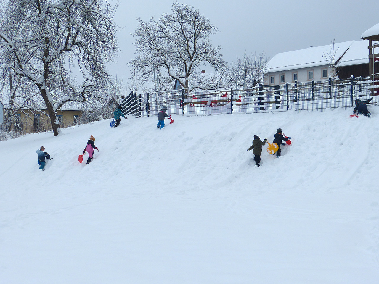 Besonders freuten sich die Kinder im Januar und Februar im hohen Schnee zu spielen. Sie bauten Schneemänner und rutschten von den Schneehügeln.