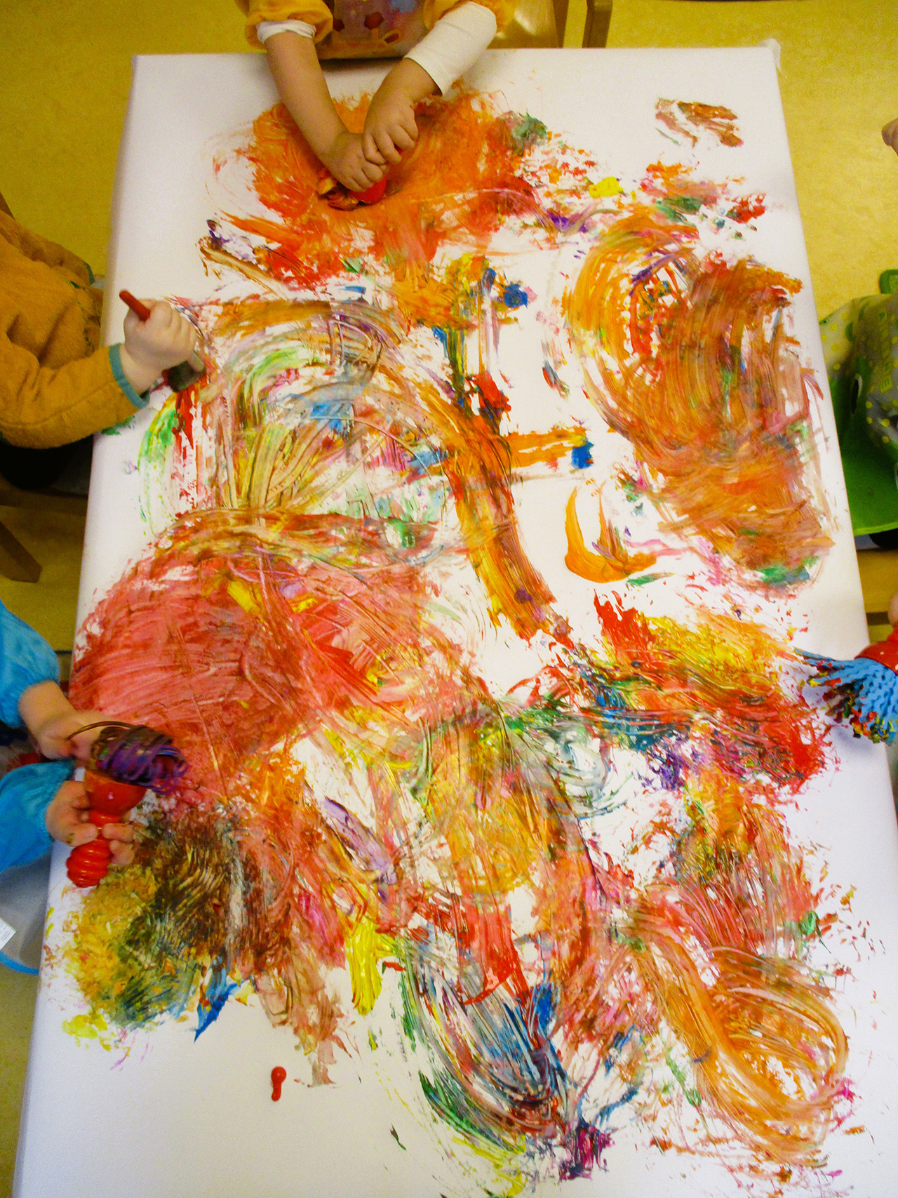 Die Krippenkinder durften sich ebenso künstlerisch verwirklichen. Als Gemeinschaftsarbeit gestalteten sie ein Tupfbild aus vielen bunten Farbklecksen.